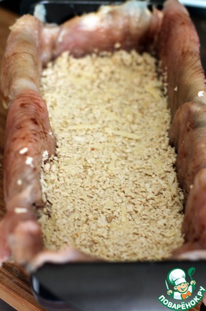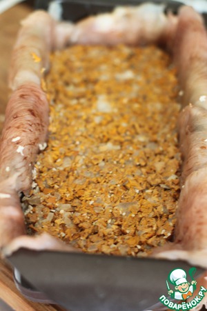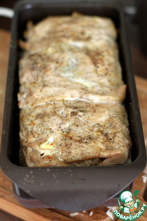 Форму для кекса смажем сливочным маслом и уложим в нее пласты филе так, чтобы края свисали с формы. На всякий случай я еще отрезала от филе пару небольших кусочков, которые мне пригодились, чтобы полностью завернуть рулет.
