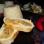 Так повелось в нашей семье, что Новый год мы чаще всего встречаем вне дома. Обычно мы уезжаем в какое-нибудь новое место с возможностью перемещаться из города в город. 2011 год не стал исключением и мы отправились в Литву - отдохнуть, посмотреть и поесть!) Этот рецепт мы попробовали в кафе рядом с Тракайским замком. Заведение держит приятный пожилой мужчина, который каждый день готовит что-то новое. У него нет постоянного меню, поэтому он просто озвучивает Вам варианты, которые есть сегодня. Нам довелось отведать отличный грибной суп из боровиков и рулет из индейки с грибами. Не уверена, что я на 100% верно воссоздала блюдо, которым нас кормили, но то, что получилось, мне очень понравилось!