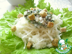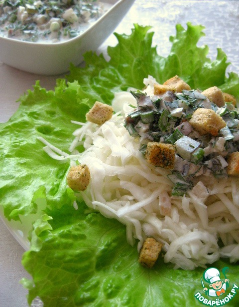 Салат подавать порционно. Для этого на тарелку выложить листья зеленого салата, на них горкой капусту, сверху полить заправкой и посыпать сухариками.