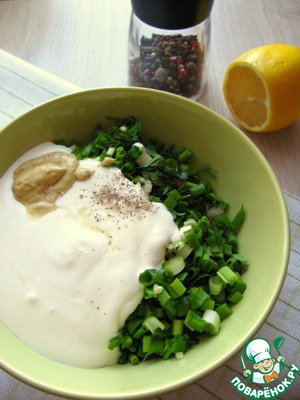 А также сметану, горчицу, лимонный сок и уксус. Немного посолить, поперчить. Все перемешать.
