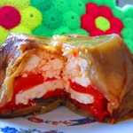 Достала из духовки, перец почистила от семечек и шкурки, разрезала на 4 части.