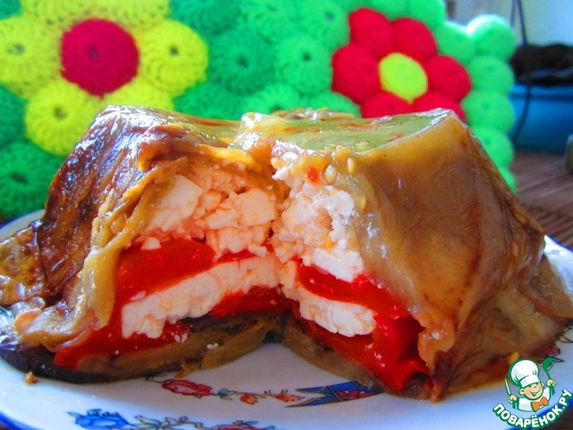 На баклажаны кладем слой перца, затем тертый сыр, затем опять перец. Сверху накрываем баклажанами ( теми, что, свешивались через края формы). Слои можно посолить.