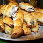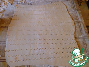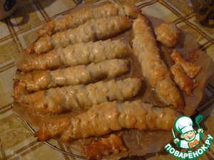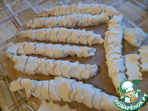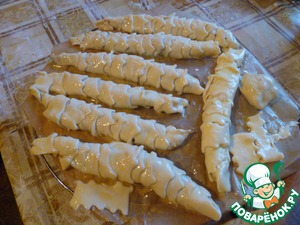 Каждую рыбинку начинаем с головы обматывать полосками теста внахлест. Выкладываем наши готовые мумии на противень с пергаментом.