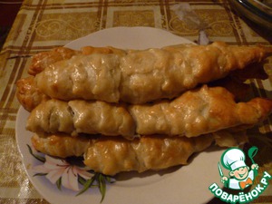 Сразу прошу прощения за такой слишком простой рецепт. Опять виноват во всем мой желудок. В нашей семье все без исключения любят мойву. Причем больше всего жаренную. Купила я доченьке на день рождение 1 кг мойвы, половину в морозилку, половину нажарила, но мне-то нельзя... Сделала себе на пару - не то... Пошла в на почту платить за свет, доця естественно затащила в магазин. Ну не с пустыми руками уходить из магазина... Купила себе 1 кг дрожжевого слоеного теста. И вот вчера придумала для себя новый вариант рыбки. И что вы думаете?! Мои сказали, что я снова сделала для себя вкуснее, чем для них...