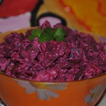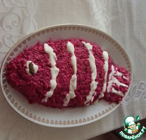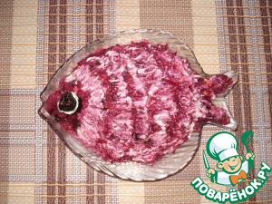 Так вот, свеклу помыть, обсушить, завернуть в фольгу и запечь при 200 градусах примерно 1 час-1:30, зависит от размера. Когда свекла остыла, очистить и натереть на крупной тёрке. Натёртой свеклы получилось около 400 гр. Смешать с рыбой, чуть присолить (аккуратно, рыба тоже солёная) и заправить майонезом.