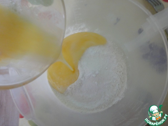 Затем добавляем молоко и растительное масло. Тщательно перемешиваем. Тесто, такое же, как на обычные оладьи.