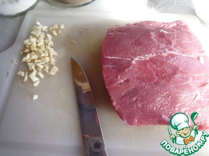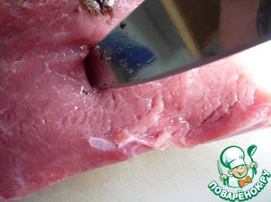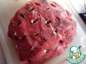 В мясе делаем небольшие надрезы. Закладываем в надрез ломтик чеснока, на кончике ножа соль и перец.