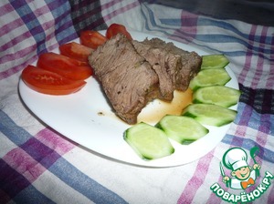 Готовое мясо режем на порционные куски. Подаем с свежими овощами, любимым салатом или подходящим гарниром. Можно полить мясо, оставшимся от запекания, соусом.