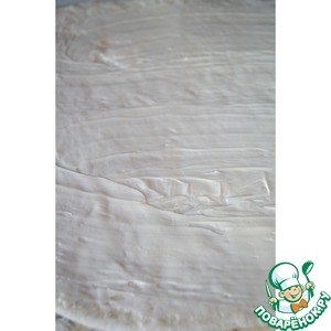 Делим тесто на две части. Каждую довольно тонко раскатываем в прямоугольник и размазываем по поверхности размягчённое сливочное масло.