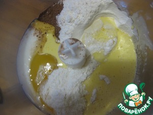 В блендер кладем сахар, яйца, муку, соду (гасим уксусом), какао-порошок, кефир, добавляем маргарин. -