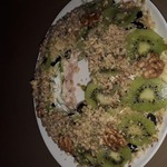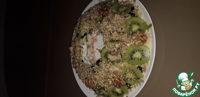 Киви очистить и нарезать тонкими пластинами. Выложить верх салата кружочками киви.