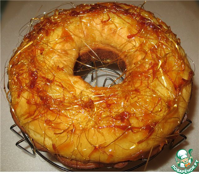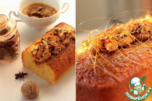Дальше мы начинаем украшать наш кекс. Часть сиропа я чуть подтопила, налила на кекс и уложила орехи, а остальной сироп тянулся сам и создавал карамельные нити. Я просто опускала в него ложку и тянула, так получались эти великолепные украшения.