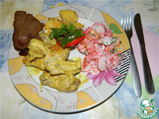 Вот такой у меня получился ужин - крылышки в соусе карри, картошка, тушеная в молоке (спасибо сайту Мульварка. ру ), и салат из овощей.