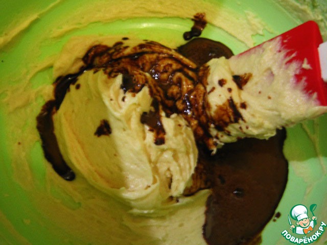 2 ст. л. кофе растворить в 1 ст. л. кипятка и добавить в оставшуюся четверть теста, перемешать. -