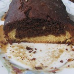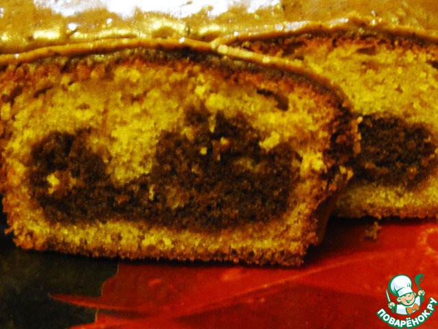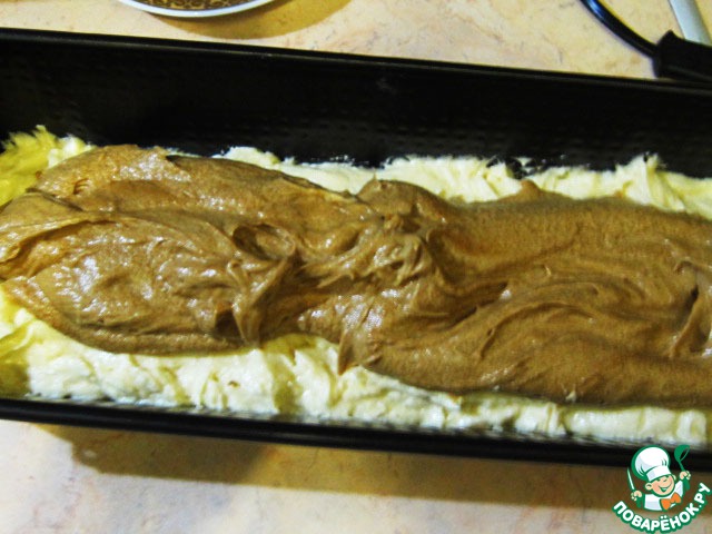 Выложить кофейное тесто в форму на светлый слой и немного потрясти форму для смешивания цветов. Можете выкладку осуществить по своему вкусу.