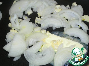 Соус: Чеснок очистить, измельчить. Луковицу нарезать полукольцами. Лук и чеснок обжарить на сливочном масле.