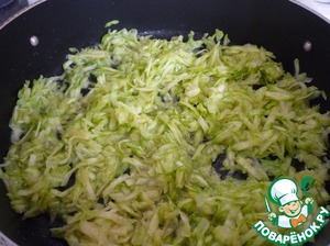 Наливаем в глубокую сковороду оливковое масло, выдавливаем через пресс 1-2 зубчик чеснока. Кладем в разогретое масло с чесноком натертый кабачок. Солим, перемешиваем и тушим 5-7 минут.