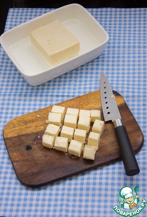 Далее все предельно просто: сыр нарезаем крупными кубиками (или мелкими - опять же, как хочется), у меня кубики примерно 1,5*1,5. -