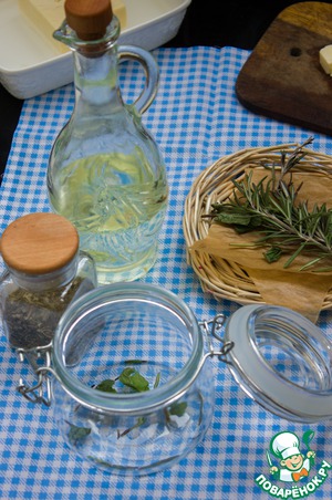 Теперь берем чистую и сухую баночку, на дно банки насыпаем сухих прованских трав, несколько веточек мяты и иголочек розмарина.