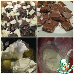 Шоколад с наполнителем разделить на квадратики, а остальные - белый, молочный и тёмный - измельчить и смешать. Масло взбить с яйцами, а сухие смеси смешать (муку, соль, сахар, разрыхлитель и какао). Соединить сухую смесь с масляно-яичной и замесить тесто.