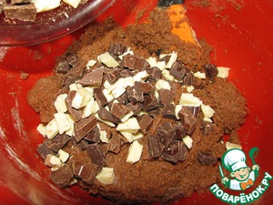 Всыпать в тесто шоколад трёх сортов и перемешать. Духовку нагреть до 180 гр. С