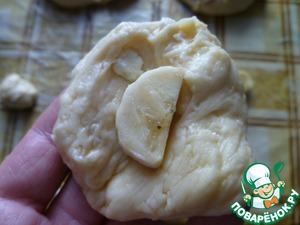 Каждую часть теста скатать в колбаску и порезать на одинаковые кусочки. Берем кусочек теста, внутрь кладем кусочек банана, можно добавить 1 ч. л. сахара. Или любую начинку по вашему вкусу.