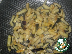 Обжарить нашу соломку небольшими порциями в большом количестве растительного масла (во фритюре). При перекладывании из сковороды отжимать баклажаны от лишнего масла.