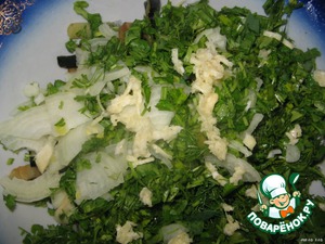Нарезать мелко зелень. У меня были только укроп и петрушка, но можно использовать любую.
