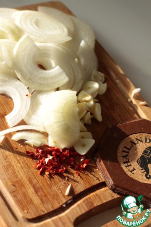 Пока курица маринуется, мы нарезаем лук, чеснок и немного чили. Выкладываем в горячую сковородку вок и обжариваем пару минут, пока лук не поменяет цвет на нежно-розовый.