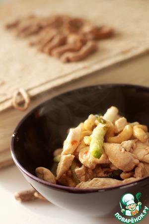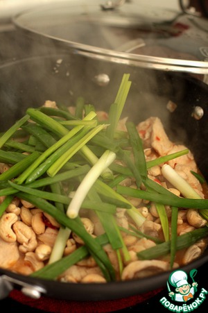 Отдельно на сковороде подсушите орешки кешью. Верните всю курицу в вок, добавьте соус, орехи и зеленый лук, нарезанный на 3 части.