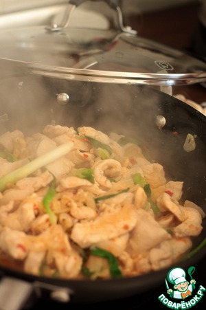 К луку добавляем курицу и готовим, пока курочка не станет матовой. Здесь надо сказать, что вок я только начала осваивать и вот на что обратила внимание - лучше готовить маленькими партиями мясо, тогда оно готовится более равномерно. Поэтому я готовила небольшими частями, перекладывая готовую курицу в пиалу.
