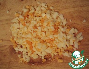 Сваренные яйца остудить, очистить от скорлупы и мелко порубить.