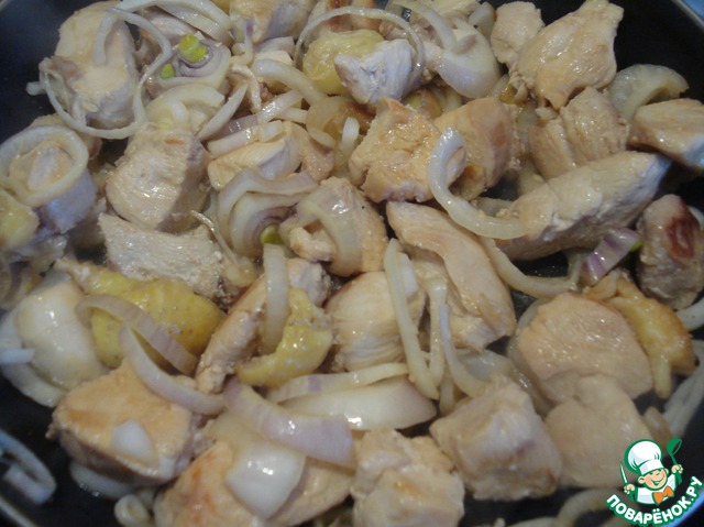 Нарезать мясо (на выбор: курица, индейка, свинина) средними кусками (я использовала куриные бедра без косточки)