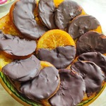 Дать апельсинам остыть. Растопить на паровой бане шоколад и покрыть им половинку кружочка с обеих сторон. Шоколад не должен быть очень густой, если он загустел, то опять немного подогрейте его на пару или в СВЧ. Поместить покрытые шоколадом дольки на лист пекарской бумаги и дать застыть при комнатной температуре.