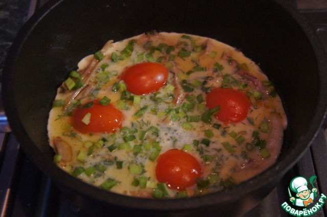 Влить яично-молочную смесь в сковороду, густо посыпать зеленым луком и запекать на маленьком огне под крышкой.