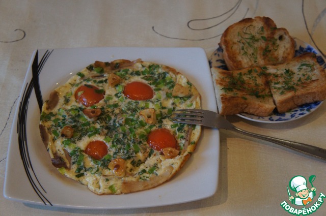 Когда омлет пропечется, выложить его на тарелку, посыпать пластинками чеснока и подать с гренками. Очень сытно. Приятного аппетита!!!