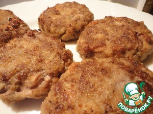 А тем временем из фарша формируем плоские круглые котлетки. Обваливаем их в панировочных сухарях и очень быстро на большом огне, буквально по 1 минуте с каждой стороны обжариваем их в том самом вытопленном курином жире.