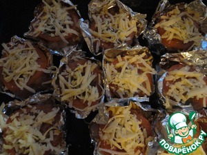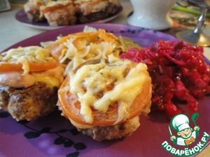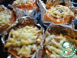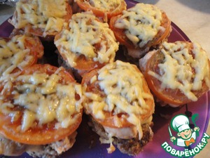 Сверху кладем кружок помидора. Его нужно ОБЯЗАТЕЛЬНО слегка подсолить, иначе он в готовом блюде будет пресным. Еще я помидор поперчила (если готовите деткам, то это можно не делать) и посыпала прованскими травами. Сверху помидор посыпаем тертым на крупной терке сыром и отправляем в духовку на 30 минут при 180-200 градусах.