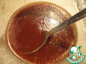Для начала, я с вечера вынула фарш из морозильника, чтобы он к утру разморозился и замариновала куриное филе. Это один из моих любимых маринадов для курицы. Вообще прелесть курицы в том, что она очень легко принимает вкус любого маринада. Итак, из соевого соуса, лимонного сока, растительного масла, томатной пасты, меда и свежемолотого черного перца вилкой сбить маринад-эмульсию.