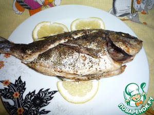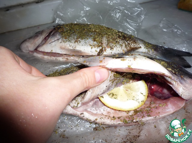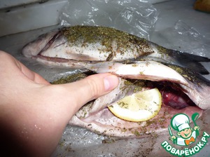 Хорошенько солим и перчим со всех сторон. Посыпаем мятой и немного тимьяна. Одну дольку лимона кладем вовнутрь рыбки.