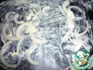 Противень промазать маслом. Положить лук, нарезанный полукольцами.