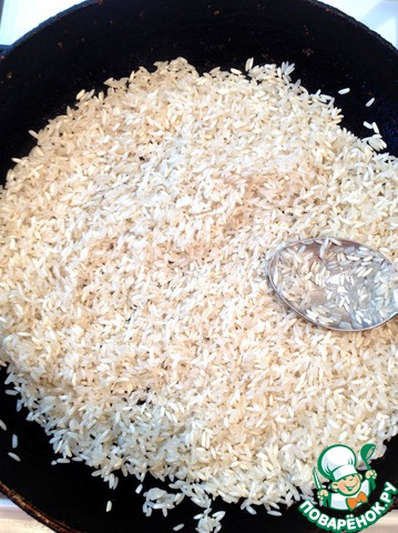 На сковороде разогреть пару ложек сливочного масла, всыпать рис, перемешать, чтобы масло обволокло каждую рисинку.