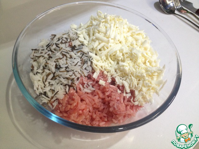 Смешиваем фарш, отваренный рис и тертый адыгейский сыр.
