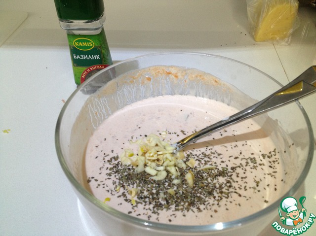 Добавить в подливу мелко нарезанный чеснок, сушеный базилик, соль, перец.