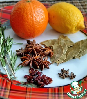 - Специи (что есть в доме: лавровый лист, бадьян, гвоздика, барбарис, розмарин, если есть - цедра апельсина, лимона,)