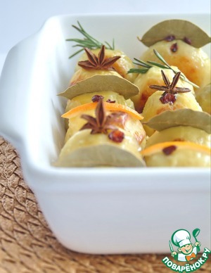 В каждую насечку на картошке произвольно воткнуть лавр, розмарин, гвоздику, звездочку бадьяна, полоску цедры лимона, апельсина и т. д, посыпать барбарисом.