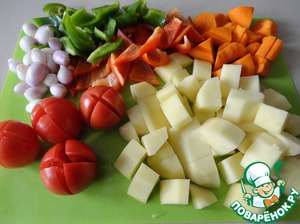 Лук чистим, картофель нарезаем не очень мелко, перцы - ромбами. Помидоры кладем плодоножкой вниз и разрезаем не до конца на 4 части.