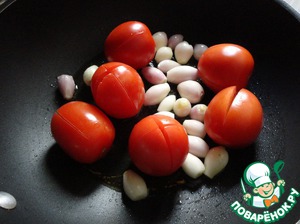 На большую сковороду или кастрюлю с оливковым маслом выкладываем измельченный чеснок и луковки. Следом кладем помидоры. Тушим под крышкой 2-3 минуты.
