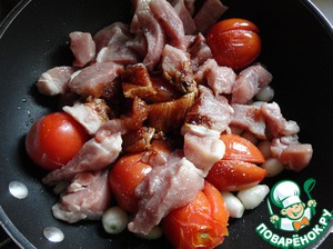 лук брала обычный, резала просто крупно. вместо целого помидора, положила нарезанный на 8 долек. правда этот помидор сразу превратился в сковородке в кашу (какой кошмар! с самого начала напортачила!
