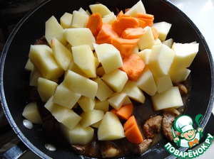 Когда мясо станет мягким (мне понадобилось минут 20), добавляем морковь и картошку. Перемешиваем. Тушим под крышкой до готовности картофеля. Если соуса оказалось многовато, выпарите его.